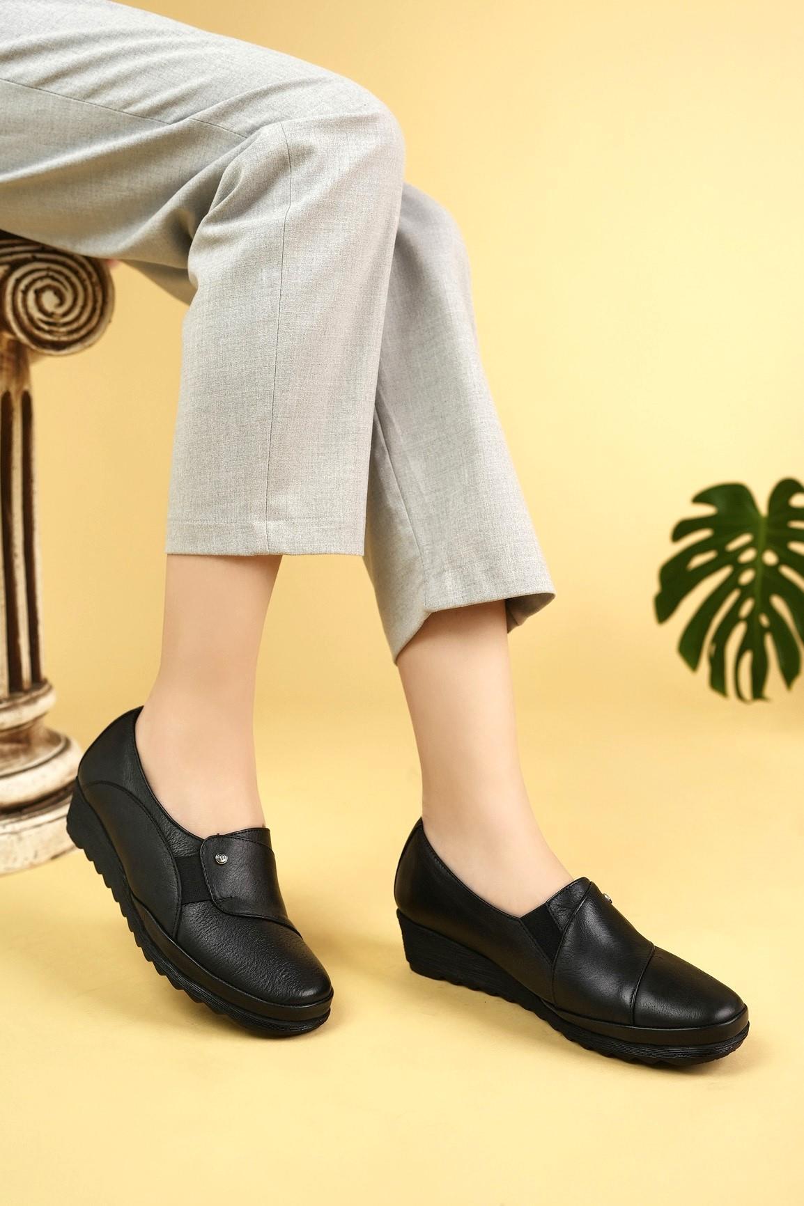 Muya 321789 Siyah Hakiki Deri 6 Nokta Lastikli Kadın Ayakkabı
